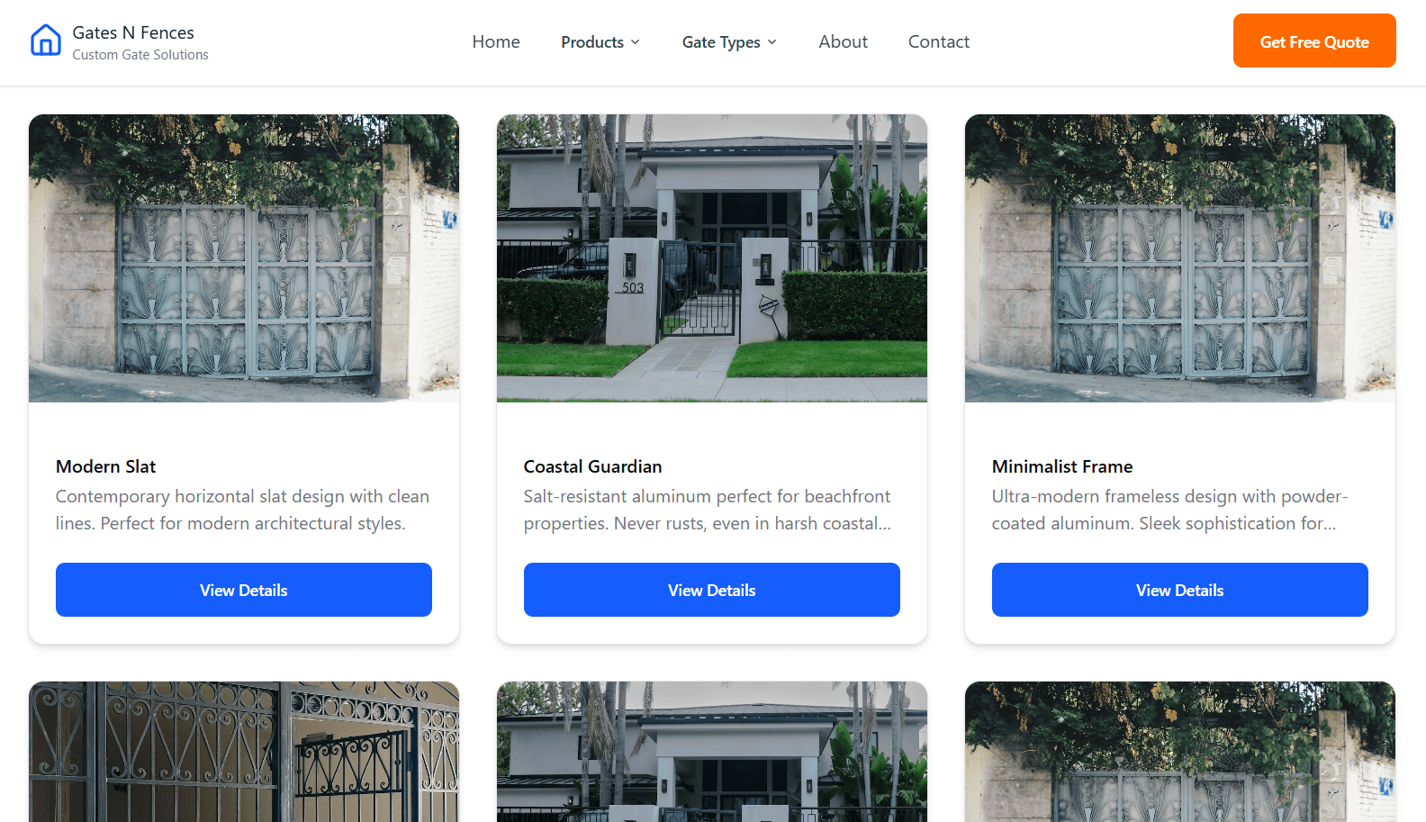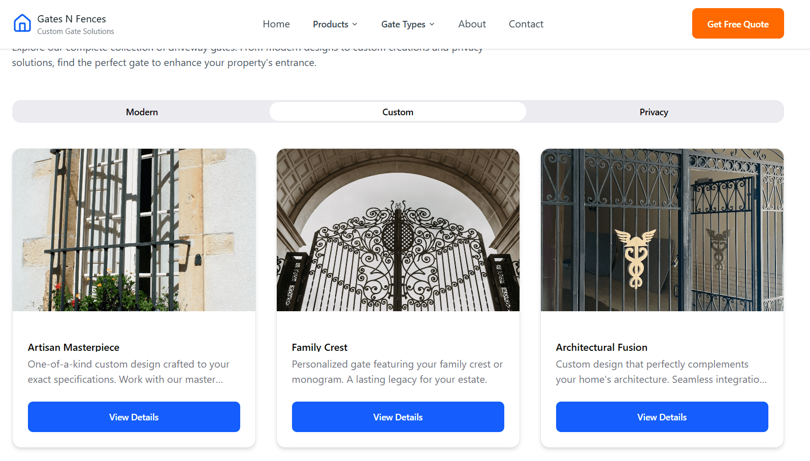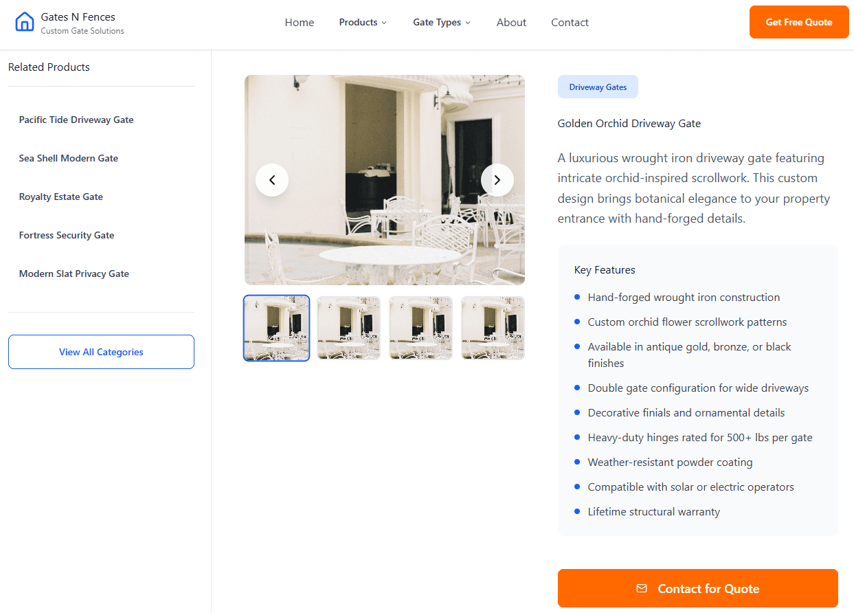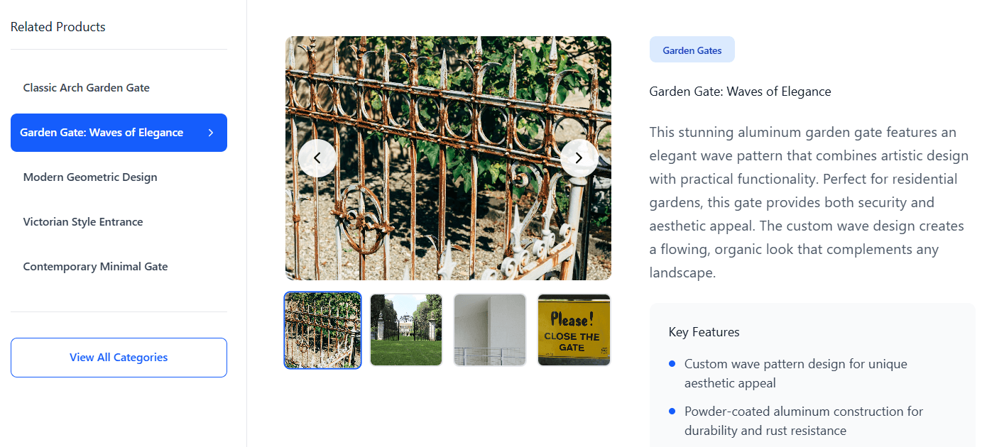 Constraints: Filters and segmented categories (Residential, Commercial, Garden Gates) guide user exploration logically.